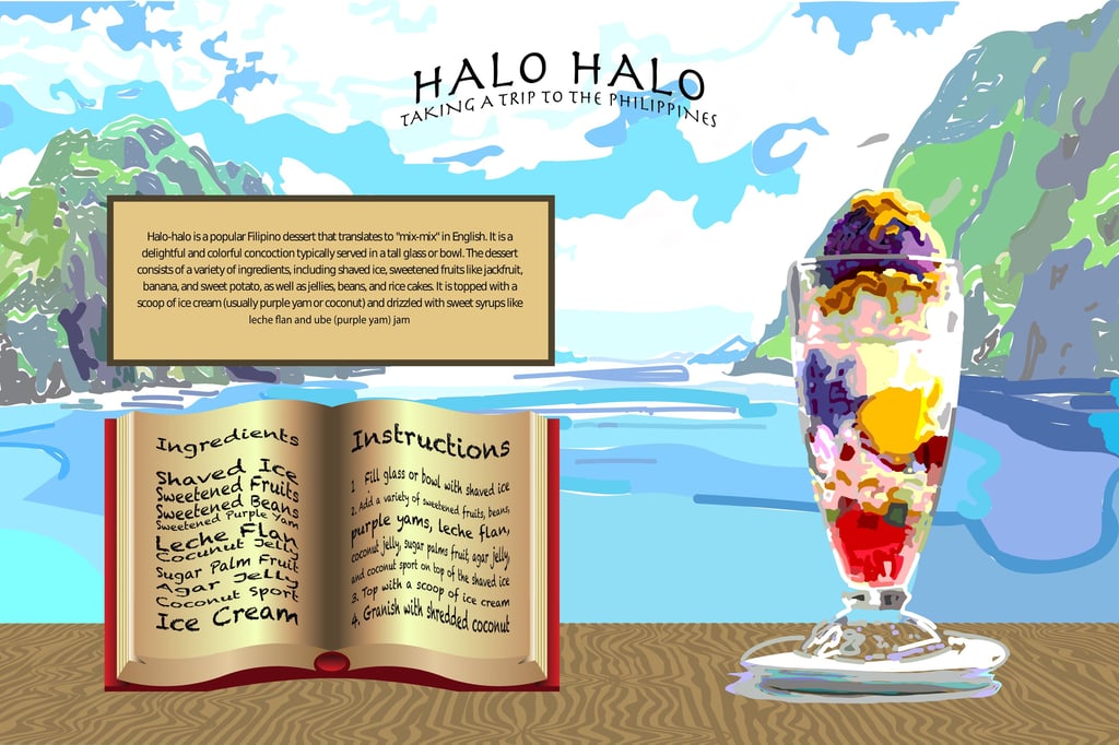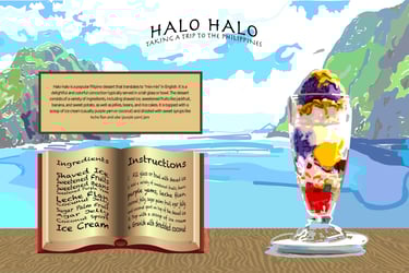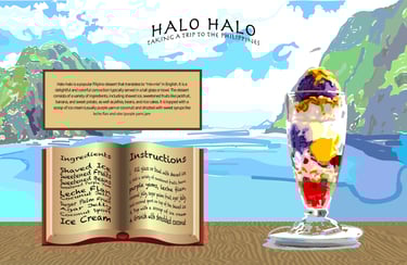 This project features a vibrant digital illustration and recipe layout celebrating "Halo-halo," the iconic Filipino dessert. By combining hand-drawn painterly textures with structured layout elements, the design transports the viewer to the Philippines through a colorful, multi-layered composition that mirrors the complexity of the dessert itself.