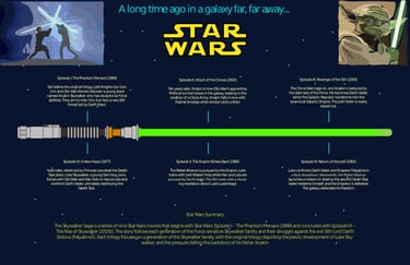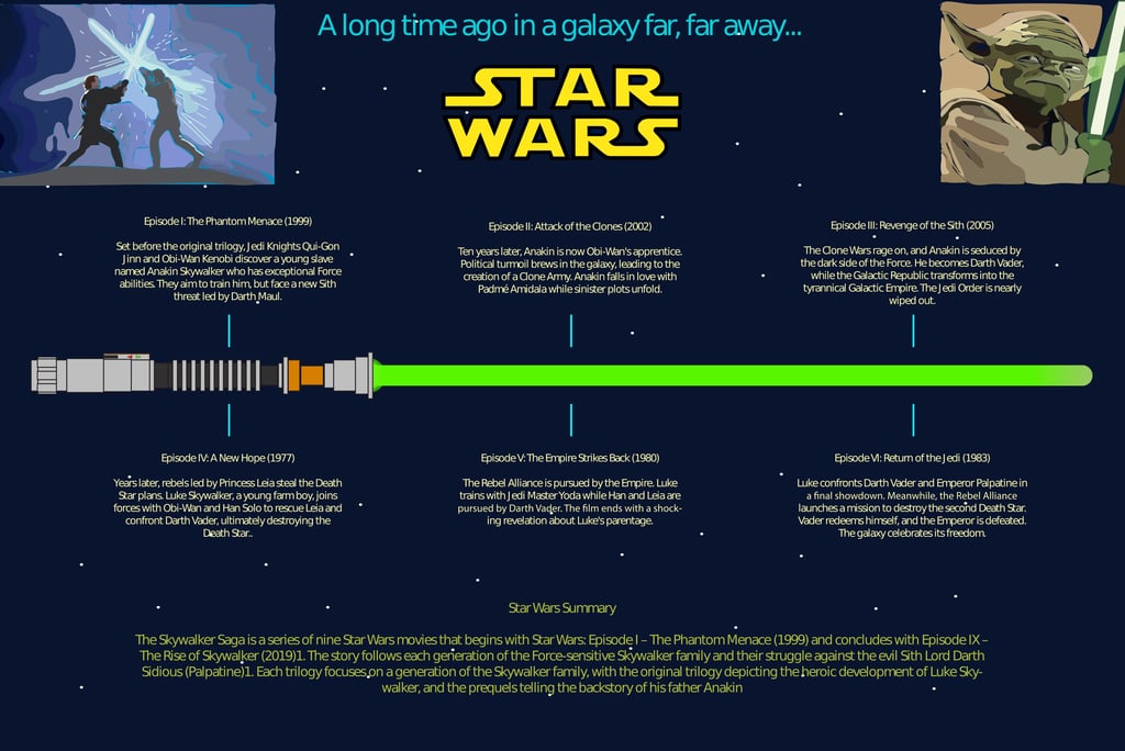 This editorial infographic organizes the complex chronology of the Star Wars "Skywalker Saga" into a single, cohesive visual narrative. By utilizing a glowing lightsaber as a central timeline axis, the design balances dense historical data with custom vector illustrations to create an engaging experience for both casual fans and scholars of the franchise.